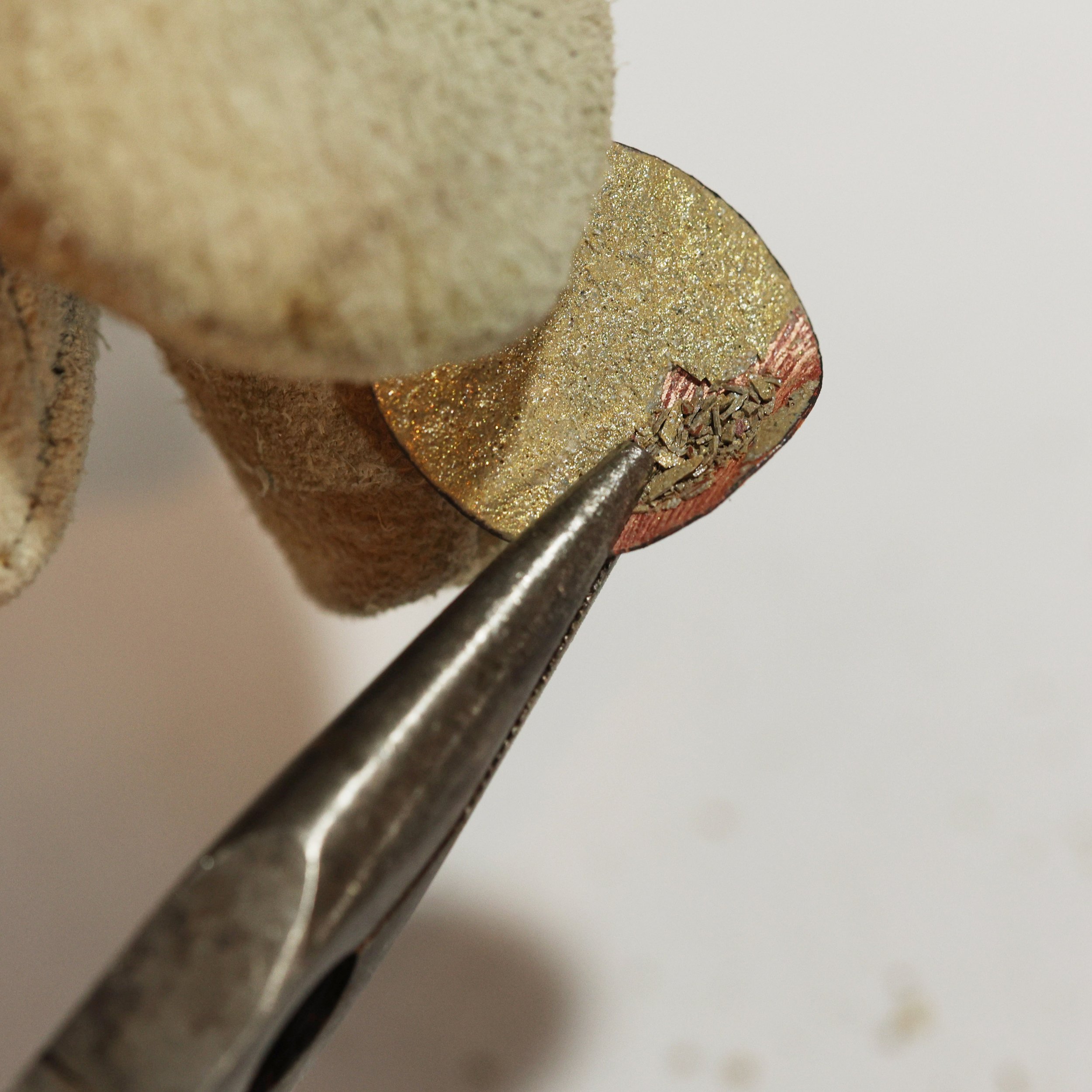 Begin by applying one or two layers of enamel onto a thin copper plate, with an optimal thickness recommendation of 0.4 mm to 0.5 mm, and notably, devoid of any counter enamel. After this, do a sugar firing. Once the piece has cooled down, remove the oxide present on the back by using a damp tissue or, for more effective results, employ a glass brush. Avoid pickling, as it is unnecessary in this context. To ensure your safety, wear gloves and protective glasses, and, with a sheet of paper beneath your workspace, utilize pliers to fold the piece onto itself, thereby breaking the enamel and yielding an array of small, dazzling flakes. Maintaining the protective glasses throughout this process is imperative to guard against potential splinters.