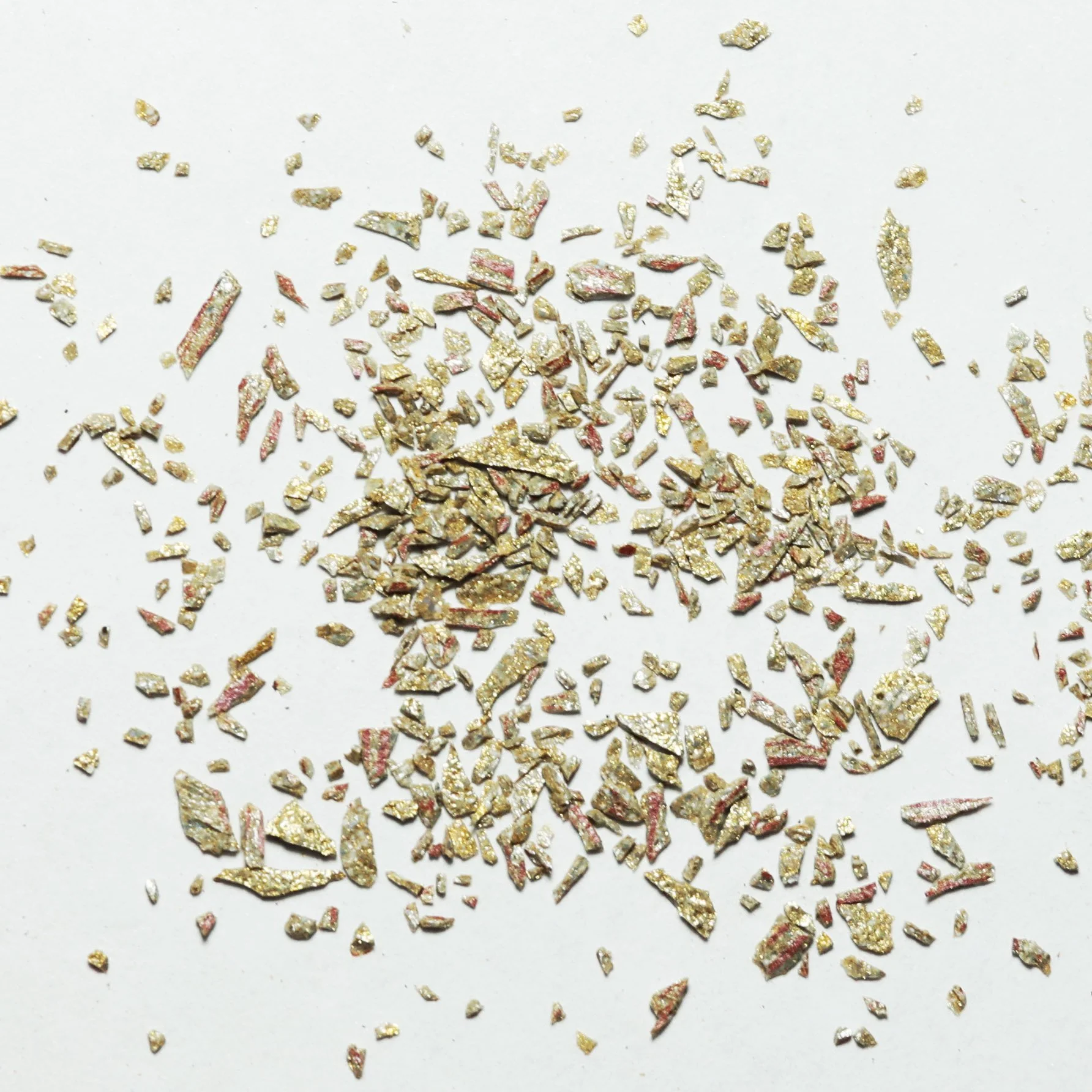 The sheet of paper will contain a blend of flakes and enamel dust. Sift it through an 80- mesh sieve to separate the desired flakes, exclusively designated for the current project, that will remain in the sieve from the residual powder that will pass through and which can find utility as enamel or counter enamel in future artistic ventures.