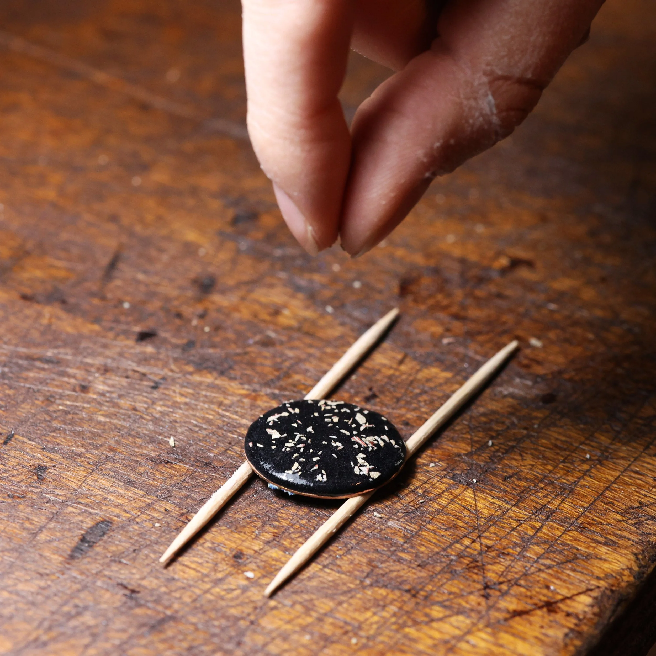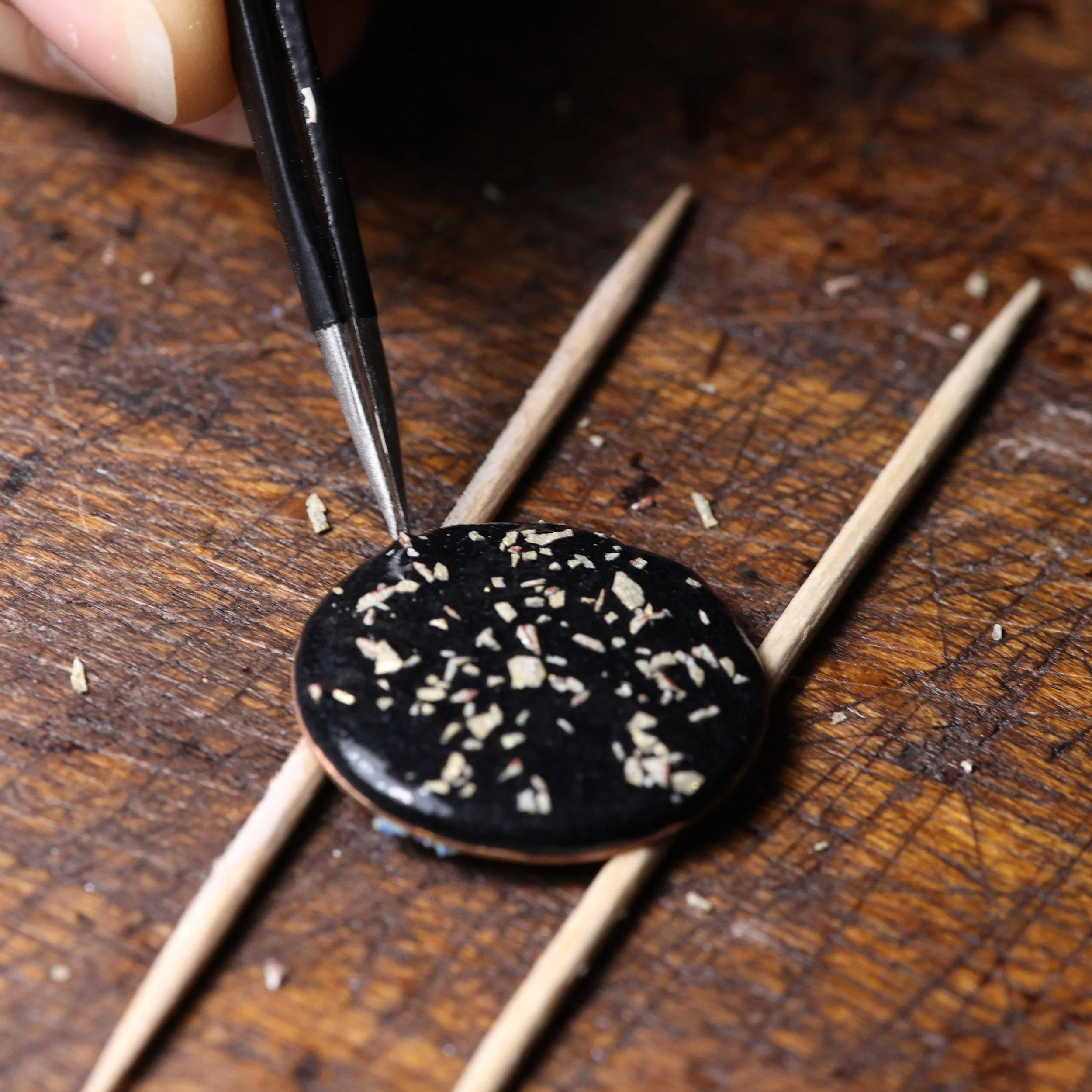 The final act involves firing the piece for 45/50 seconds on a 3-point trivet at around 820 °C, a duration sufficient to render the base enamel, in this case the opaque black, glossy. Should a preference lean towards less raised flakes, a more prolonged firing is an option, bearing in mind that this might slightly temper the strength of the metallic effect, in this case, or shimmer.