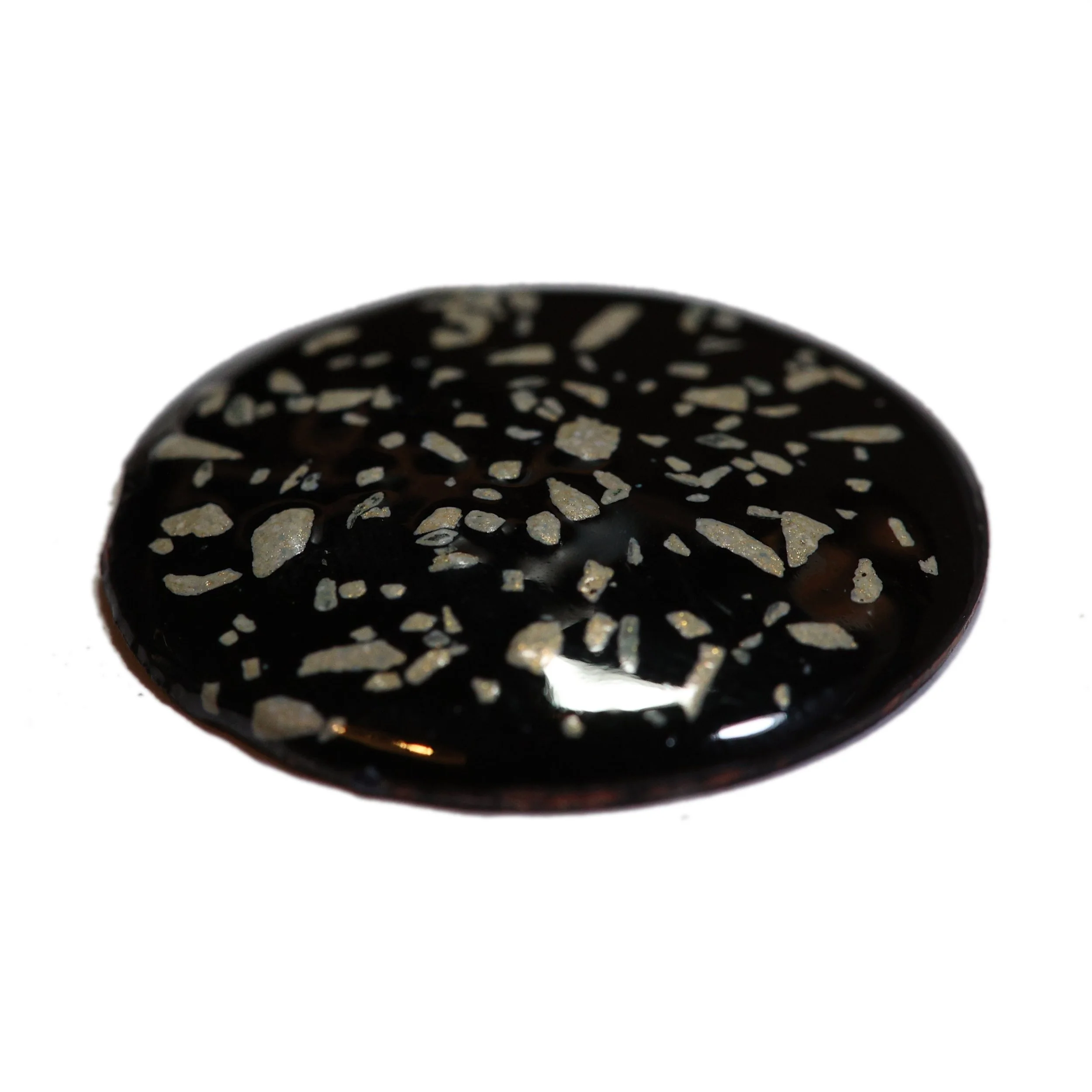 Transitioning to another piece of previously counter-enameled copper, commence by wet packing a layer of either opaque or transparent enamel. A key consideration here is selecting an enamel with a relatively low melting point, avoiding harder enamels. I opted for black enamel, chosen for its aesthetically pleasing contrast with No. 41 used to create the flakes. While the base enamel is still in its wet state, sprinkle the flakes with your fingers over it, akin to the act of seasoning with table salt. Should flakes require adjustment or removal, tweezers prove handy in this process.